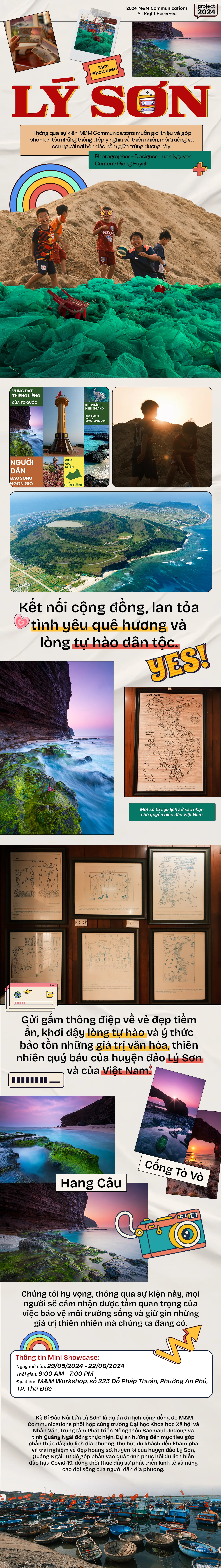 Mini Showcase "Kỳ Bí Đảo Núi Lửa Lý Sơn" là một sự kiện đặc biệt do M&M Communications và M&M Workshop kết hợp tổ chức, nhằm tôn vinh và quảng bá vẻ đẹp độc đáo của Lý Sơn. Trưng bày trong sự kiện là những hình ảnh xinh đẹp về con người và thiên nhiên do đội ngũ M&M ghi lại trong quá trình tác nghiệp tại huyện đảo xinh đẹp này.