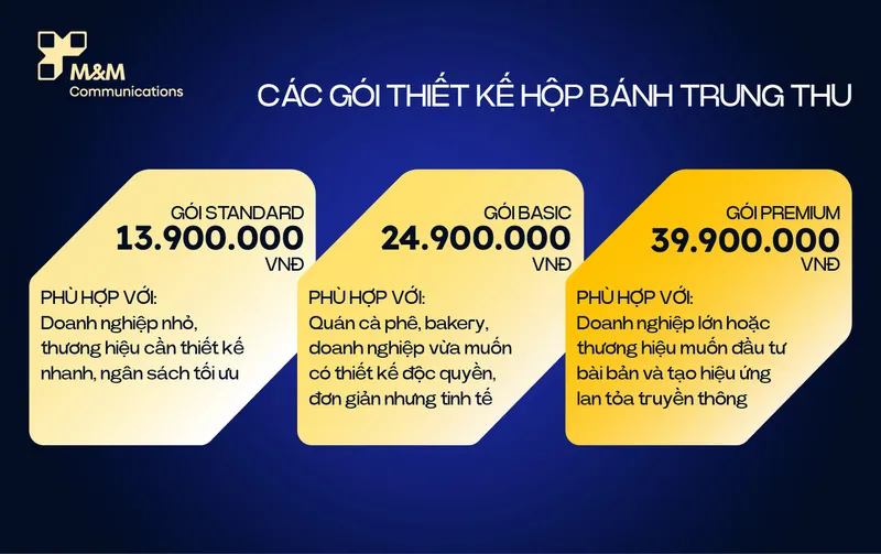 Với kinh nghiệm thiết kế bao bì quà tặng doanh nghiệp, đặc biệt là các chiến dịch Trung Thu hằng năm, M&M Communications giới thiệu 3 gói thiết kế hộp bánh Trung Thu đa dạng, đáp ứng mọi nhu cầu từ các startup nhỏ đến thương hiệu lớn muốn đầu tư chuyên sâu.