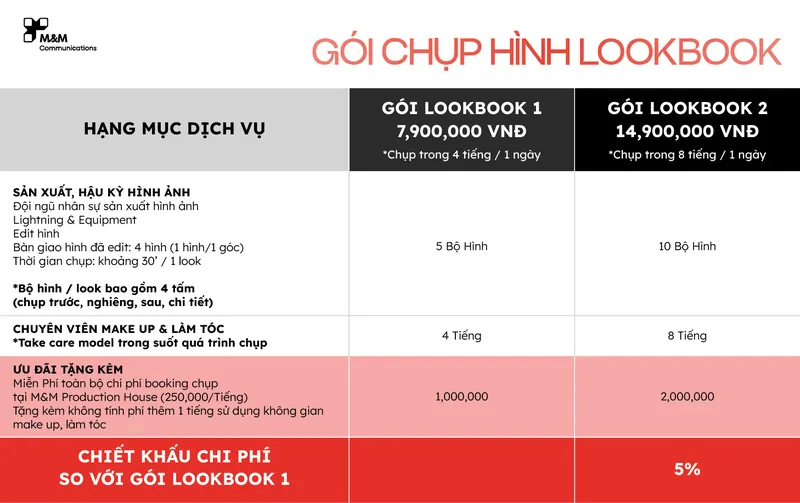 Với kinh nghiệm sản xuất hàng trăm bộ ảnh cho các thương hiệu lớn nhỏ, M&M Production House mang đến 2 gói dịch vụ chụp lookbook chuyên nghiệp – trọn gói, tiết kiệm thời gian và đảm bảo chất lượng hình ảnh.